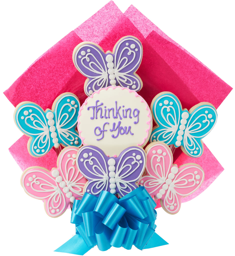 Brighten someone’s day with our Thinking of You Flutter Bouquet, a beautiful arrangement of hand-decorated butterfly cookies surrounding a heartfelt “Thinking of You” centerpiece. Each cookie is baked fresh and expertly crafted with colorful icing details, creating a sweet and cheerful gift that’s as delightful to look at as it is to eat. Perfect for sending love, comfort, or encouragement, this gourmet cookie bouquet is a thoughtful way to show you care — one delicious bite at a time. Choose 5, 7, 9 or 12 cookies.